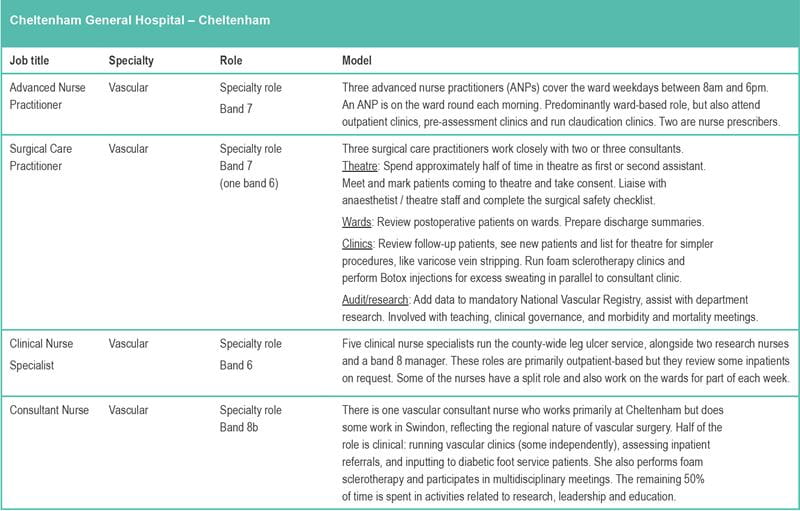 Cheltenham’s vascular department has had surgical care practitioners since 2002. The roles were introduced to help augment the roles of doctors in core and higher surgical training in theatres in the context of reduced trainee numbers. The department went from four to two higher surgical trainees and from two core trainees to one. The introduction of advanced nurse practitioners into the vascular department was accompanied by a contraction in foundation doctors (from three to one F1) and was designed to support those foundation doctors who remained while helping to make up for those who were gone. The medical director highlighted significant scope for further expansion of advanced nurse practitioners, starting with providing weekend cover to the wards. He could envisage a model for the future where wards are staffed entirely by non-medical practitioners reporting to registrars.