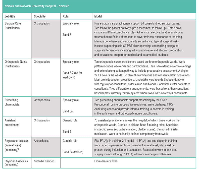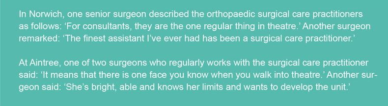 This hospital also describes itself as the first in the country to appoint surgical assistants – now called orthopaedic surgical care practitioners. Today there are five such practitioners; three are theatre-based, where the service need is described as greatest, but two cover the whole patient pathway.