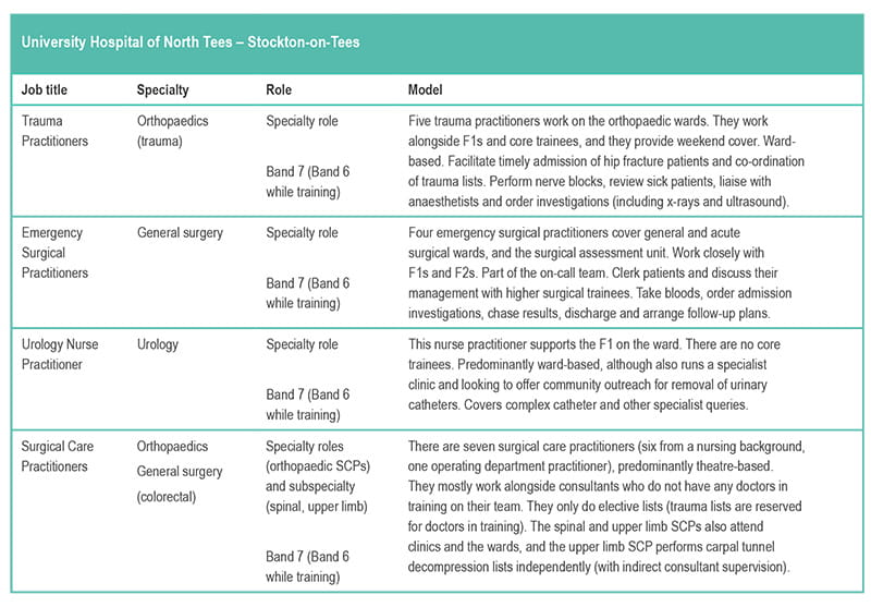 The hospital already had a tradition of extended nurse roles in areas such as accident and emergency and paediatrics, so used this as the basis to extend nursing roles in surgery. Trauma practitioners were introduced first, and have since been added to, with other surgical practitioners tailored to specific surgical specialties. The Nurse Director said: ‘The gap they are filling in the rota is ward cover, so nurse practitioners on the wards work as the doctor on the ward.’