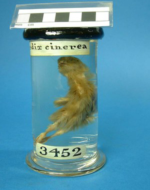 This grey partridge (RCSHC/3452) is a historical specimen made by or for John Hunter. It is part of the “Products of Generation” series, the entirety of which, in contrast to the decimated “Circulatory System” series, survived the bombing of the College in 1941. It shows a young bird near the end of incubation, with well-developed legs, beak and plumage.