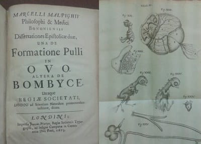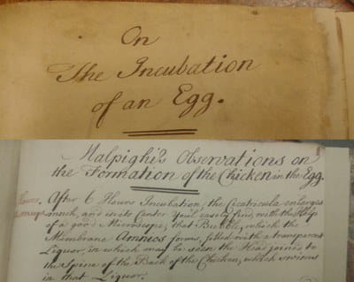 In the archives, we hold a manuscript (MS0062) entitled “On the Incubation of an Egg.” Although it contains the date 1769, we have no further information about when it might have been written or who the author might be. This is often an issue in archives and can make it difficult to fully understand the significance of the item in question. As you can see from the image, some of the manuscript notes are observations on Malpighi’s work. Interestingly, we do have a copy of Malpighi’s Dissertationes Epistolicae duae una de Formatione Pulli in Ovo. Written in French and published in 1673, it details the formation of the chicken in the egg and contains some fascinating descriptive plates – our French hens.