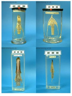 John Hunter collected thousands of preparations from over 500 different plant and animal species, and his lectures stressed the relationship between structure and function in living things. These preparations of four birds’ tongues and larynges, or voice boxes – you might even say, what they use to call with – are a great example of how his collection supported the study of comparative anatomy. Whilst the swan’s tongue (bottom left, RCSHC/1469) has spikes which act like a sieve when feeding, the woodpecker’s (bottom right, RCSHC/1477) is long, sharp and narrow, for spearing insects inside tree trunks. The raven’s cleft tongue (top left, RCSHC/1480) has been the subject of folklore for centuries. The stork’s (top right, RCSHC/1473) is more unremarkable, but alternate narrow and broad tracheal rings can be seen, which are peculiar to wading birds and help prevent the lateral dislocation of the neck.