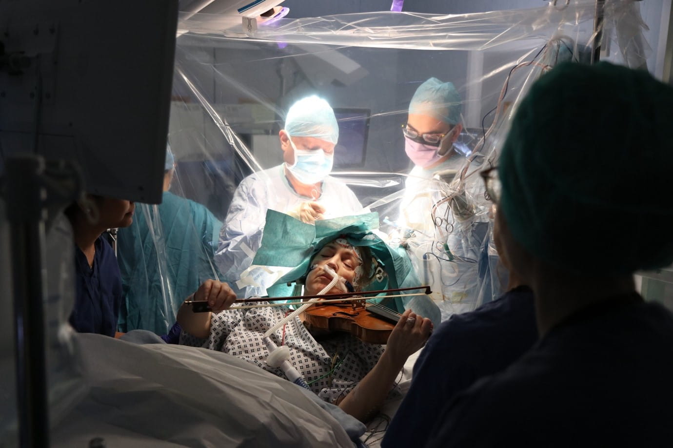 The photo captures awake craniotomy and brain mapping surgery we performed to remove a brain tumour while Dagmar, our patient, played the violin. Brain mapping is nowadays increasingly used when brain tumours are located near those parts of the brain that control movement. The aim, then is to maximise the extent of tumour resection while preserving the motor function. We can do this under general anaesthetic with excellent results. In Dagmar's case, however, we needed to protect her motor function to the highest levels of dexterity, so any/slightest impairment was not acceptable. This is because Dagmar is a professional musician, and her life is defined by her music. In her own words, when she came to see me in the clinic before surgery - if she could not play her music, she would rather die of the tumour than have it operated on. Indeed, this is partly why she specifically sought me as her surgeon, even though she lived elsewhere in the UK. She knew my musical background (pianist with a music degree) and felt I would have the empathy and the understanding to respect her concerns and wishes. Playing professional violin is perhaps the most dexterous task known to humans. Therefore, we both decided the best way to ensure 100% preservation of that function was to have her awake and play the violin during the surgery. It all worked out well, we removed the tumour and she was playing her violin in her orchestra three weeks after the surgery and continues to do so three and a half years later.