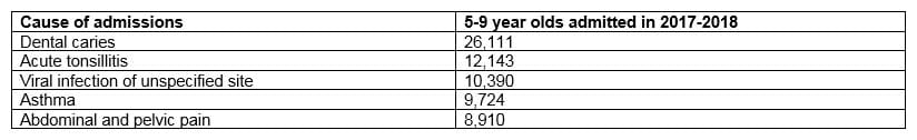 More than double the number of 5-9 year olds were admitted to hospital for tooth decay than acute tonsillitis in 2017-2018. 12,143 children were admitted to hospital for acute tonsillitis, 10,390 for a viral infection of unspecified site, 9,724 for asthma and 8,910 for abdominal and pelvic pain.